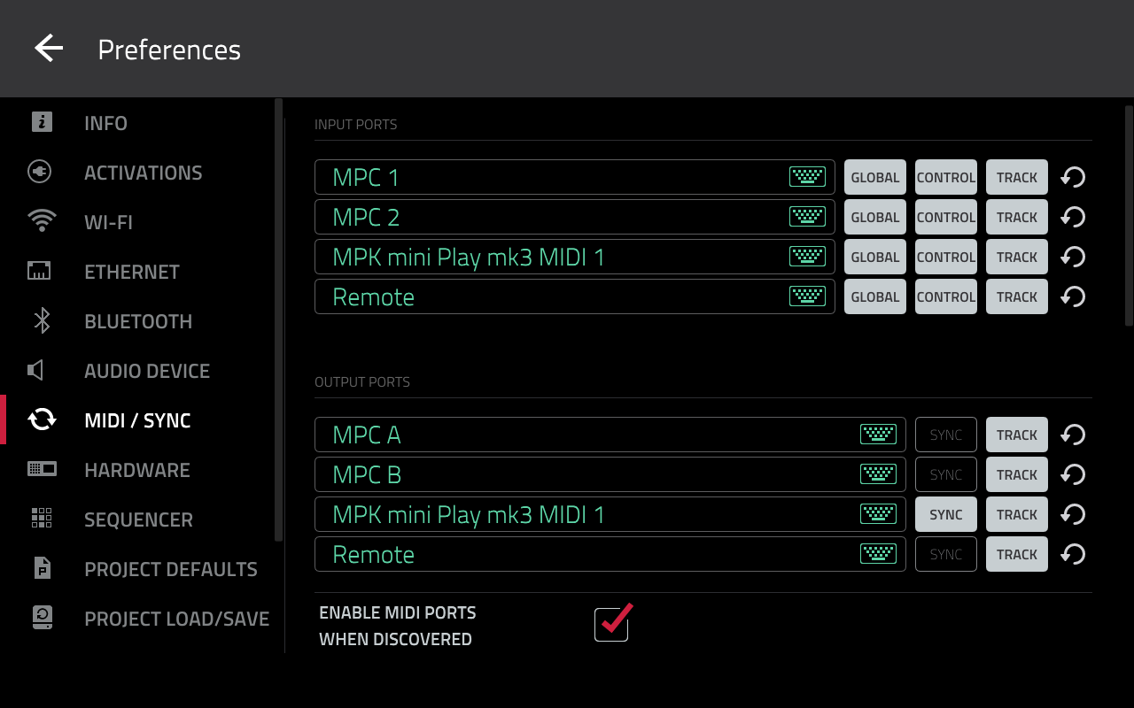 The Output Ports section in MIDI/Sync Preferences will display all available MIDI output ports in a list. MPC A-D* refer to the physical 5-pin MIDI ports on the rear panel of the hardware.