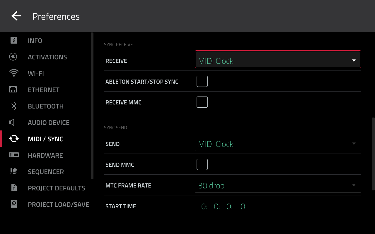 - When Sync is enabled, the MIDI output port will send MIDI sync messages according to the selections made under MIDI / Sync > Sync Send > Send. This is useful if you only want to send MIDI Clock and/or transport controls to an external device. See the following section for more information regarding Sync Preferences.