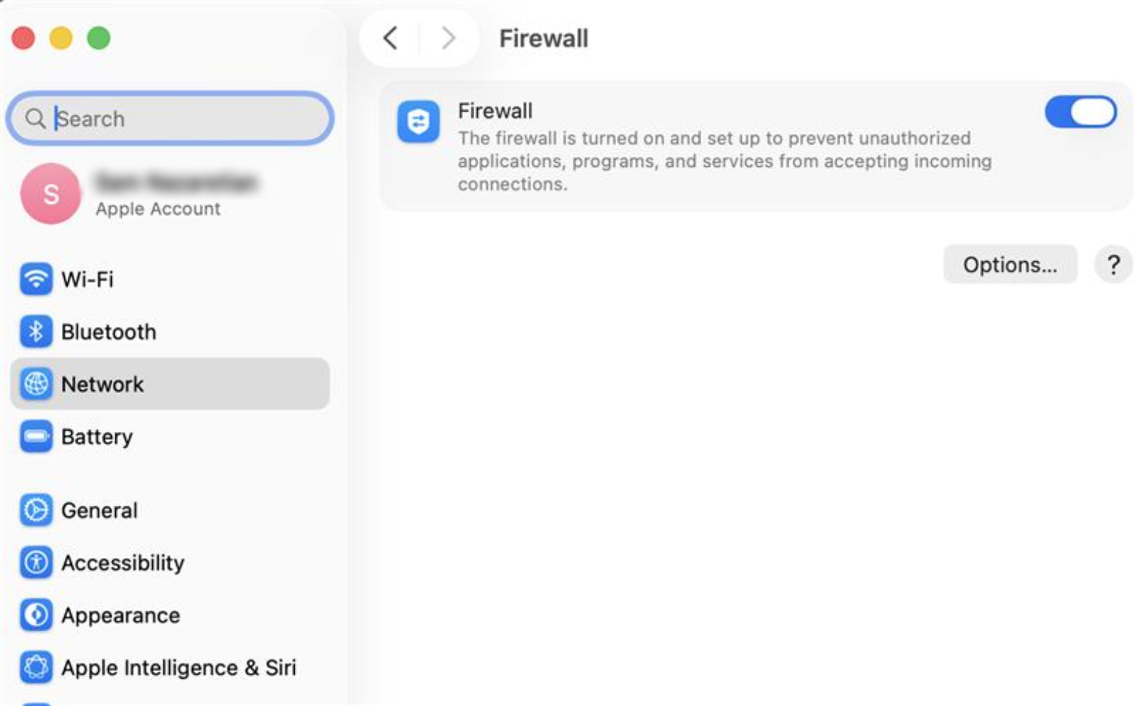 - If the Options button is disabled, ensure the firewall is turned on.