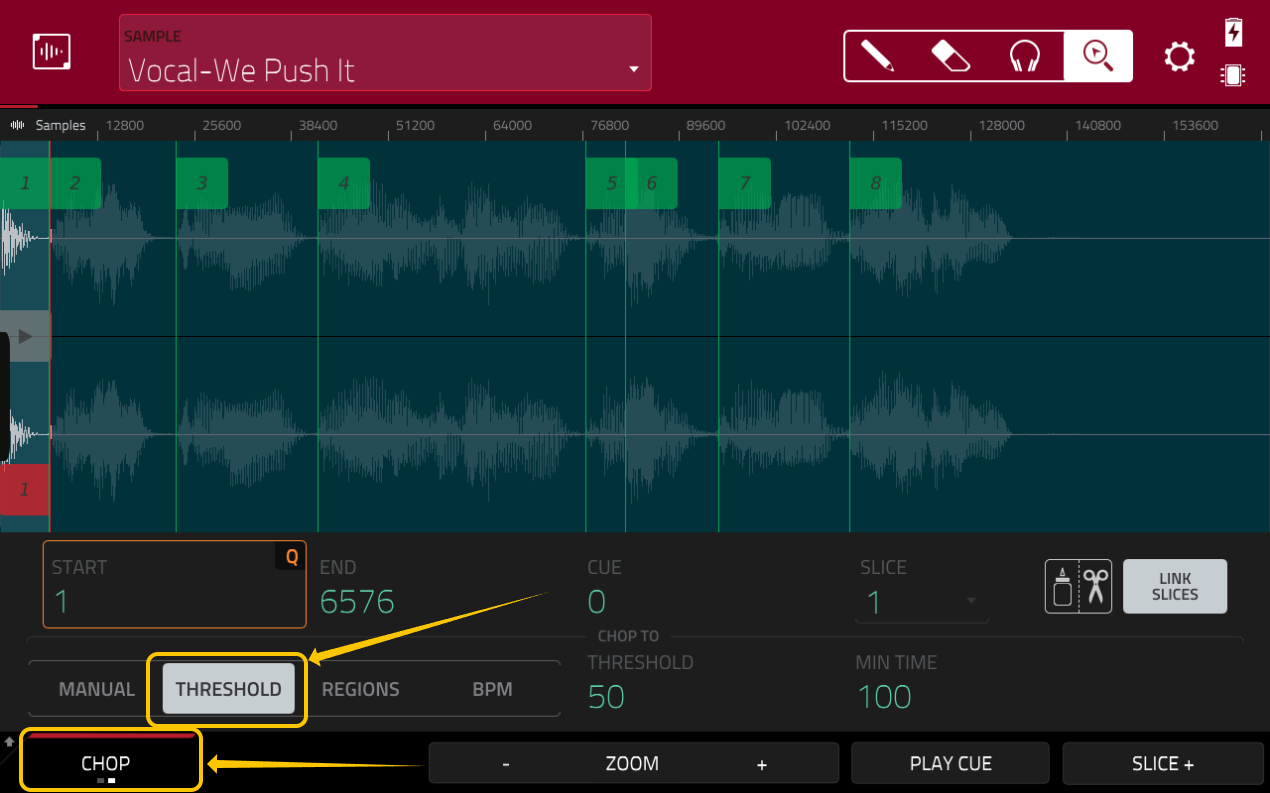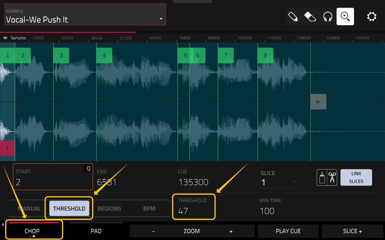 5. Tap the Threshold button to automatically chop the sample and assign the chopped segments to the pads.