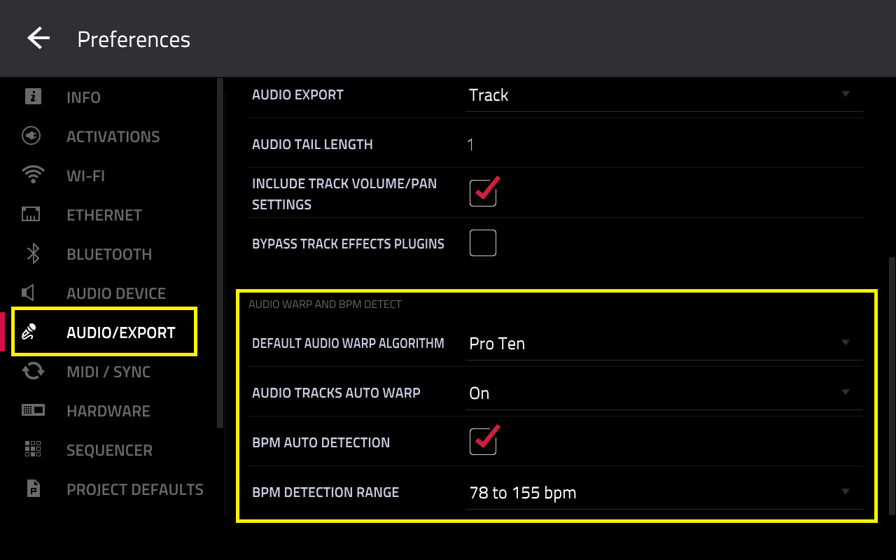 To set this up, go to Menu > Preferences > Audio/Export > Audio Warp And BPM Detect and configure your settings like so: