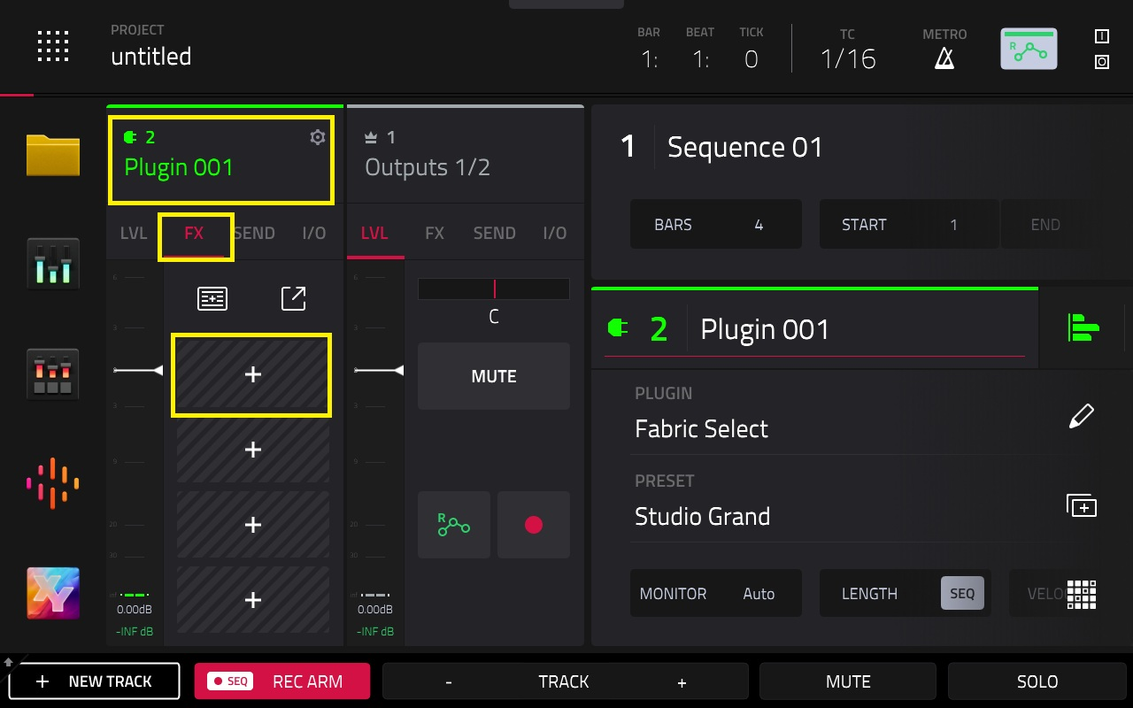 FX: To use the included FX, you'll need to open up the FX inset slot on a track, then tap the + icon