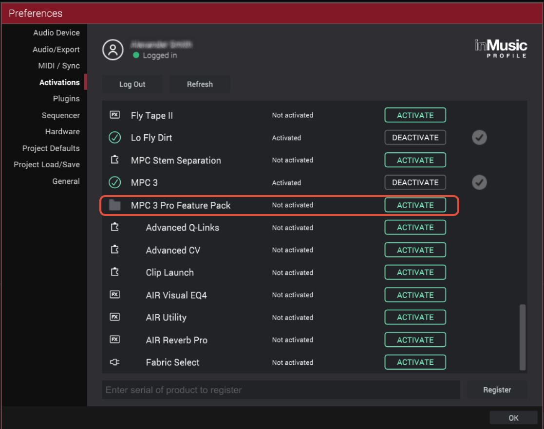 To verify that it is in our account, ensure you have logged in to your inMusic Profile on the MPC Live III itself to redeem the licence by going to Menu > Preferences > Activations