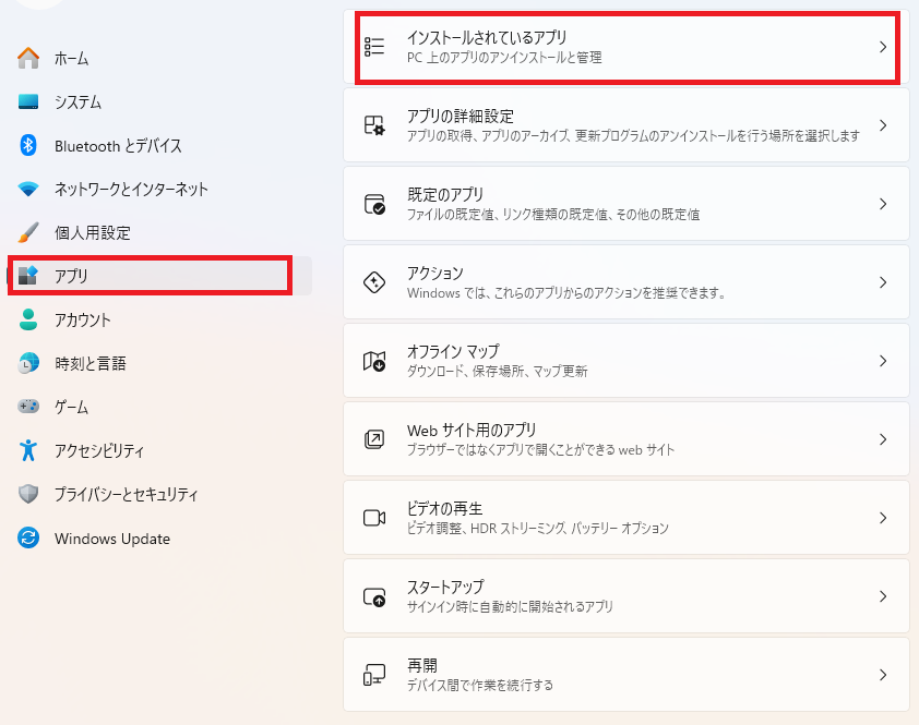 - Windowsの「プログラムの追加と削除」ユーティリティ(「設定 」>「アプリ 」>「インストールされているアプリ」)に移動します: