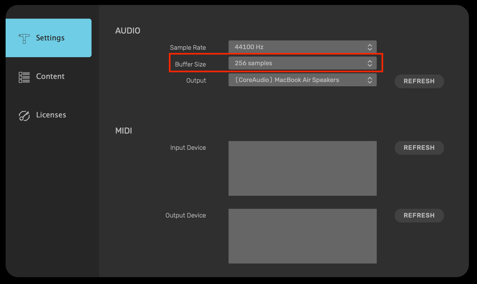 DAW(Ableton、Cubase、Logic Proなど)内でBFD3をプラグインとして使用する場合は、DAWの設定からバッファサイズを調整する必要があります。