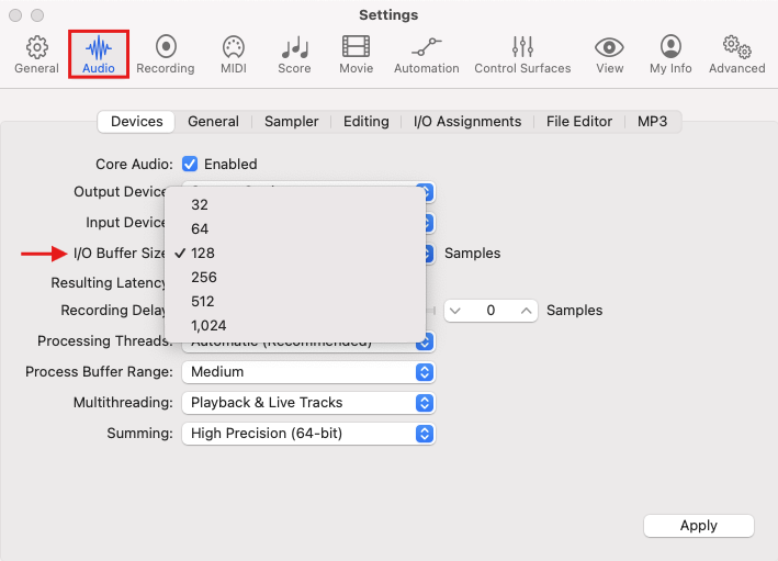 - Buffer Sizeを探し、値を下げます。 (出発点としては128サンプルか64サンプルあたりから始めるのがよいでしょう。)