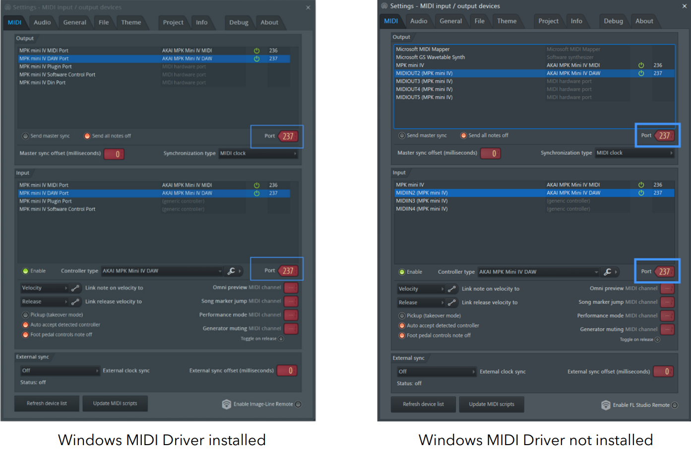 b. DAWポートのみ、ポート番号コントロールをドラッグして237に設定します。MPK mini IV MIDIポートが空白であることを確認します。