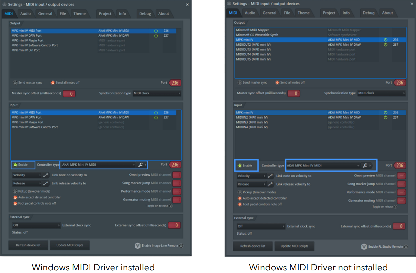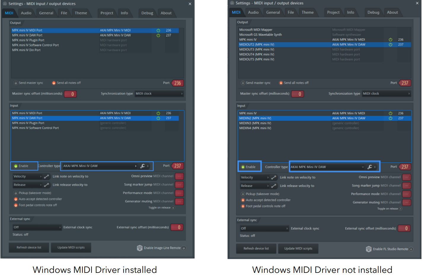 - MPK mini IV MIDI入力を選択し、Enable をクリックしてコントローラーとして有効にします。コントローラー・タイプのドロップダウン・メニューがAKAI MPK Mini IV MIDIに設定されていることを確認してください。