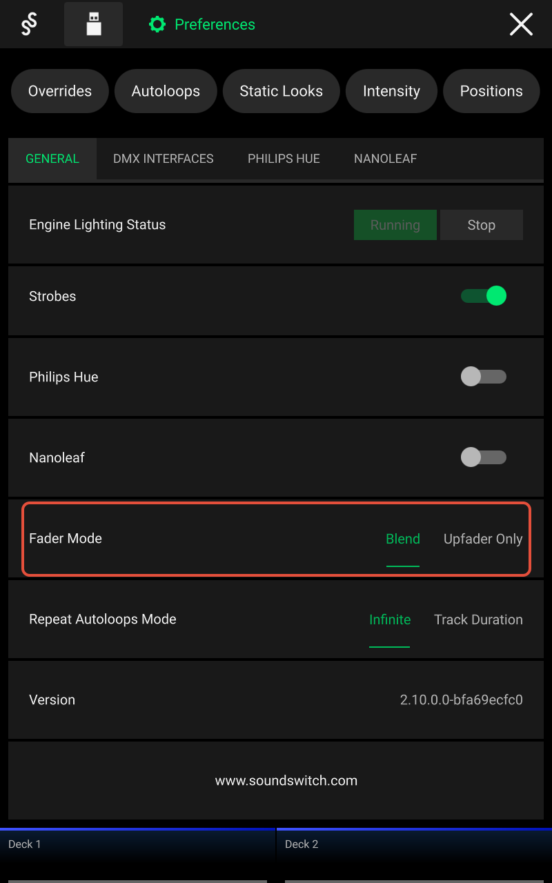フェーダーミキシングは、DJパフォーマンスに合わせてライトショーをブレンドしたり、切り替えたりすることを可能にするコア機能です。SYSTEM ONEでは、各ライトショーの輝度は、各デッキのアップフェーダーの位置、またはクロスフェーダーの位置(あるいはその両方)によって調整されます。フェーダーの設定は、Engine Lighting Preferences メニューで変更できます。
